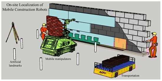 Undoubtedly, to ensure safe human operation or self-navigation, nearly all mobile construction robots, whether teleoperated or autonomous, rely on estimated poses provided by the localization module []. However, construction sites are spatially complex, and construction tasks lead to a lot of chaos on the site. They have semi-open and chaotic properties, which means the robot has to locate itself in the building process with the structure they are building and maintain a globally consistent reference frame. Additionally, as the construction task progresses, the environment faced by the robot undergoes gradual changes [], the dynamic changes in the environment during the progress of the construction task pose a challenge for establishing a consistent coordinate system necessary for accurate localization. For these reasons, the positioning of autonomous mobile construction robots for chaotic environments is still a significant issue.
