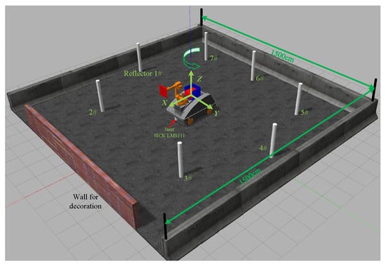 The initialization is performed by rotating the mobile platform at the origin of the global coordinate system to construct an artificial landmark map. The platform is designed with four Mecanum wheels, so the turning radius during rotation is zero. It ensures that the global and local coordinate systems coincide at the start-up of the mobile construction robot, facilitating positioning during movement. The accuracy of the artificial landmark extraction could be evaluated by comparing the coordinates of the artificial landmarks obtained from the laser reflection intensity with the true values from the Gazebo 9. In our tests, the laser sensor is the SICK LMS111, which offers a scanning range of , an angular resolution of , and the artificial landmarks are reflective columns with a radius of 10 cm. The adaptive clustering threshold is set to according to Formula (1). An idealized scenario is constructed to evaluate the recognition accuracy of artificial landmarks because the true values from Gazebo 9 provide a benchmark for accuracy estimation.