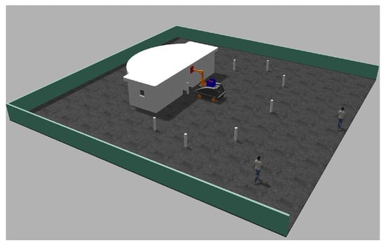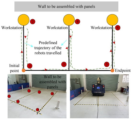 Utilizing mobile construction robots in building sites is quite a novel venture. To illustrate this usability status in detail, a digital construction scenario is drawn up. As shown in Figure 9, the mobile construction robot combined with manual labor is responsible for the installation of the curtain wall [], and the AGV handles the transport of construction materials. Here, we focus on the fused positioning of the mobile construction robot based on artificial landmarks in this site, improving the positioning accuracy of the robot to realize precise working.