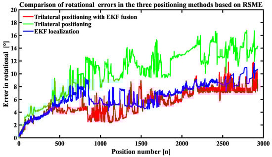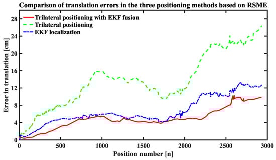 The root-mean-square-error (RMSE) is a common evaluation criterion for the localization of mobile robots [,]. It is used as the primary evaluation metric for comparisons; the localization results of the trilateral localization, the fusion algorithm of this paper, and the EKF Localization are evaluated separately in comparison with the true value of the positional trajectory.