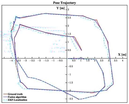 Similarly, such positioning errors can be shown to differ in employing pose trajectories as shown in Figure 15. Here, we demonstrate the pose trajectory obtained by setting our approach and EKF Localization, while the true ground positional trajectory is obtained through the Gazebo setting. At the initial moment, the three trajectories are nearly coincident. This indicates that errors between the positioning results are extremely small over short periods. However, over time, the localization results of EKF Localization gradually deviate from the ground truth, while the fusion approach in this paper achieves higher overlap with the ground truth. Thus, the trajectory of our approach is closer to the true pose, demonstrating the robust nature of the fusion algorithm.