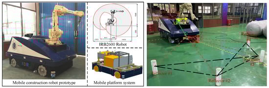 In practical construction, architectural tasks often result in the presence of numerous miscellaneous temporary placements within the construction site. Therefore, minimizing the dependence of mobile construction robots on environmental structures can ensure the stability of the positioning in such a chaotic and changeable environment. Conventional mobile robot positioning algorithms can be classified as relative and absolute positioning []. Absolute positioning, using GPS, landmarks and other technologies for localization, is more capable of processing complex conditions and unpredictable environments. Thus, our mobile construction robot is developed to be a fully self-contained unit with accurate absolute positioning capability. This approach eliminates the tedious calibration process during the initial setup and ensures the uniformity of the coordinate system in the chaotic environment.