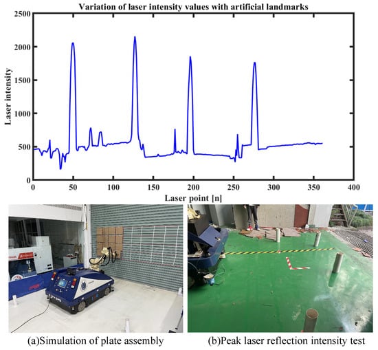 The detection and recognition of artificial landmarks are the cornerstones of positioning. Therefore, artificial landmarks recognition and detection based on laser reflection intensity are first validated in on-site environments. As Figure 17 shows, four artificial landmarks are arranged on site, and the laser intensity values are mutated four times. The position of the artificial landmarks is identified from these mutation values, thus enabling the positioning of the mobile construction robot.