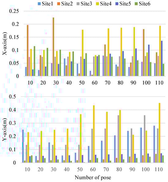 The horizontal axis represents the counted positions, while the vertical axis represents the deviation value along the coordinate axis direction. The deviation indicates the extent to which the actual position trajectory differs from the ideal one. A smaller deviation value corresponds to a closer match between the actual and ideal position trajectories, resulting in reduced positioning error. In the x-axis direction, the maximum deviation from the ideal position is no greater than 0.25 m, while the maximum deviation in the y-axis direction is not more than 0.45 m. Additionally, we calculate average deviations of 0.085 m and 0.138 m in the X and Y axes, respectively. This average deviation is approximately equivalent to the 10 cm positioning error in the simulation environment. Overall, the deviation in the y-axis is more pronounced than that in the x-axis for positioning. However, the average deviation in the y-axis is smaller than in the x-axis. The larger deviation values are concentrated at the fourth station, which is closer to the construction wall and lacks artificial landmarks in the vicinity. This deficiency in artificial landmarks observed by the robot at the fourth station may lead to a greater positioning error in that specific location.