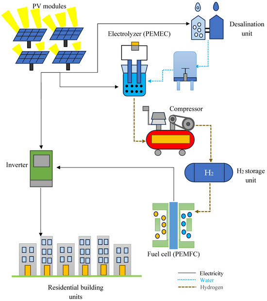 Figure 1 introduces the studied system. In this system, PV modules are responsible for producing power with received solar radiation. The consumer is also a number of residential buildings, and the system is off-grid, which means no electricity exchange between the system and the network happens. If the generated electricity is more than the requirement of the consumer, then the extra produced PV modules are sent to an electrolyzer (EC) (which is a proton exchange membrane (PEM)), where water is decomposed into H2 and O2 through electrolysis reactions. The produced H2 by the PEMEC is then compressed and is sent into the H2 storage unit. The stored H2 is utilized during the time the PV modules could not offer the consumer requirement (nights, times with cloudy skies, low radiation levels, and so on). It is consumed by a fuel cell (FC) to generate electricity. The considered type of FC here is a PEM, like with the EC. Since electrical energy by both the PV modules and PEMFC have a direct current (DC), the system was equipped with an inverter as well to change the DC to an alternating current (AC) for electrical appliances in the building.