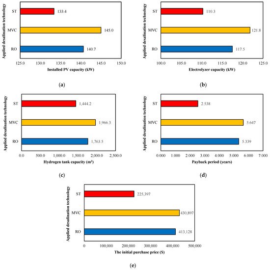 In the multi-generation systems with both electricity production and a need for fresh water, one of the crucial issues is the type of desalination technology used, since conventional desalination systems consume a considerable amount of energy and also impose a high cost. Therefore, based on the literature review conducted in the previous part, as a novelty, this investigation comes forth with the idea of using STs as an alternative for conventional desalination technologies to achieve higher technical and economic benefits. A multi-generation system with PVs as well as PEMEC-PEMFCs, which are responsible for providing electricity for a residential building complex, are considered. STs are compared with RO and MVC systems, two widely used conventional technologies, in terms of various performance indicators, such as the required amount of PV installation, electrolyzer size, hydrogen storage tank volume, the initial purchase price of the system, and PBP. A parametric study has also been conducted to realize the impact of building load on the performance indicators.
