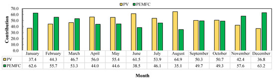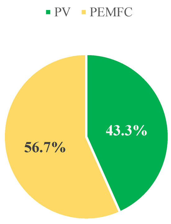 In the time deficit in the power production of PVs, PEMFCs come into operation. In a PEMFC, H2 is supplied from the storage tank and takes part in the reaction with O2. The reaction is accompanied by generation of work (electricity) and heat at the same time: