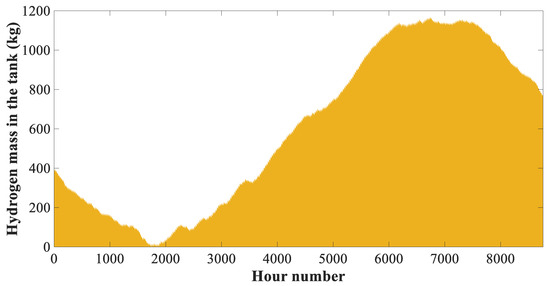After being compressed by the compressor, H2 enters the storage tank for use at the times when PVs are not able to meet the required power of the building. H2 behaves like an ideal gas. Therefore, the hydrogen storage tank volume () could be computed using Equation (10) [36]:
