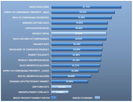Referring to the key variables used as inputs in conducting feasibility analysis in ascertaining the viability of projects (Figure 1), as mentioned earlier, development projects often occur over a lengthy timeframe, forcing analysts to decide whether to proceed with a potential project that may enter the market several years in the future. However, such longer-term measures as rental escalation and sales growth escalation are less frequently used. Similarly, it is also significant that, except for interest rates, macroeconomic indicators are rarely employed. This empirical result resonates with Crosby et al. [], for instance, in that the most frequent indicators used by European developers are short-term supply and demand information. That the present study’s results indicate the use of DCF and capital budgeting measures as a primary means of decision making also points to the prevalence of short-term thinking in what is often a long-term time horizon. The generally accepted notion within the real estate development industry that a feasibility study is conducted with the aid of Microsoft Excel, proprietary feasibility analysis software, or occasionally manual calculation is supported in our findings, with the addition of Argus Estate Master DF. However, the finding that approximately one half of the respondents use proprietary development feasibility programs is new. On the other hand, it is not surprising to find that proprietary feasibility software will usually have several key industry-accepted hurdle rate metrics that are automatically calculated, as decision makers would normally have these metrics readily available and therefore not need to specifically calculate their results.