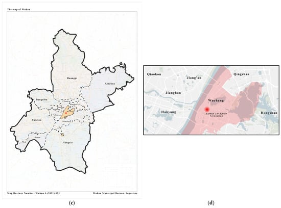 (a) Location of Hubei Province in China. (b) Location of Wuhan in Hubei Province. (c) Location of Wuchang district in Wuhan. (d) Location of James Jackson Gymnasium. Base map source: Standard Map Service (https://www.resdc.cn, accessed on 30 September 2023).