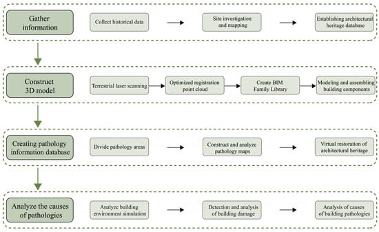 This article first uses 3D laser scanning to collect the physical information and pathology information of a historical building and uses register360 1.0 to splice the 3D scanned point cloud data and images; then, DP-Modeler 3.0 three-dimensional modeling software to process the obtained point cloud data to generate a refined 3D spatial information of historical buildings, followed by import into Revit to establish a parametric component family to form a BIM model and build a three-dimensional information model and current situation model of the historical building based on drawings, photos, and measurement data [], focusing on the pathology information of historical buildings in the BIM model, and dividing the pathology areas corresponding to the actual pathology photos. At the same time, the historical building pathology map is generated through the BIM schedule function to provide basic data for later preventive protection and maximize the visual management of pathology. Finally, Ecotect 2011, Geomagic Qualify 2013 and other software are used to simulate the environmental factors caused by the historical building pathology and the damage condition of the building itself and to analyze the causes of the pathology.