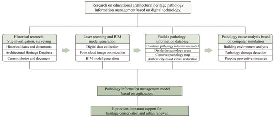 Rapid advances in technology have led to an increasing demand for this type of information in the field of cultural heritage and architectural conservation. The article aims to use digital technology to obtain, record, store, and display accurate and intuitive information about architectural heritage for daily management and repair of that heritage. This article conducts a comprehensive and in-depth study of the pathology information from the James Jackson Gymnasium, a typical case of the modern educational architectural heritage of Wuhan. Research contents include obtaining point cloud data through 3D scanning, constructing Building Information Modeling (BIM) 3D models and pathological information models to visualize the affected parts, using the Monument Damage Diagnostic System (MDDS) to establish a pathological information map management system, using virtual simulation technology and digital repair technology to diagnose and repair the affected parts, and establishing a systematic architectural pathology information database to explore the causes of architectural pathology from a multidisciplinary perspective. The authors aim to gradually promote this method and build a systematic pathological information database of architectural heritage. This utilizes the sharing characteristics of information technology to transcend the barriers of time and space and provide important support for heritage protection and pathology management. The Architectural Pathology Information Management System is proposed as an innovative solution to promote the sustainable conservation of architectural heritage through digital technology.