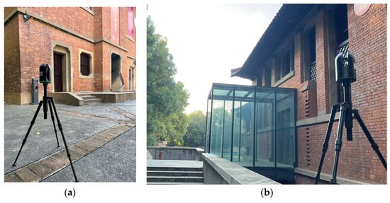 Three-dimensional laser scanning is a fully automatic, non-contact, high-precision three-dimensional scanning technology. A large amount of point cloud data on the surface of the measured object are collected through cloud measurement technology [], and the spatial information and color/grayscale information of the measured target point are recorded []. The advantages of 3D laser scanning are: 1. Non-contact measurement, reducing secondary damage to historical buildings. 2. High data collection efficiency and strong real-time performance. 3. High precision, with errors reaching millimeter levels, and the ability to describe the details of objects in detail. 4. Fully digital characterization, high degree of automation, easy information transmission, processing, expression, and convenient operation. Even though the accuracy of current 3D laser scanners is very high, it is still necessary to strictly ensure that the measurement method of the scanning instrument is accurate to ensure the accuracy of the scanning results [,].