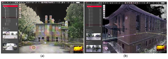 Then, after the splicing is completed, the gap between the point cloud data is small, and the registered and spliced historical building point cloud model is roughly similar to the actual historical building shape, and there are no obvious problems such as damage, deviation, and misalignment []. The processed point cloud is saved to obtain point cloud data in LAS format (Figure 8a,b). The color of the line in the figure represents the matching quality, and the position of the circle represents the point cloud position.