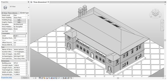 This article is based on the modeling of building components such as “floor surface—walls—beams and columns—doors and windows—roof trusses”. After completing the model of each building component, the outer contour points of the building are superimposed to form a complete James Jackson Gymnasium BIM building model (Figure 11). It records in detail the component dimensions, building area, bay depth, and overall height of the James Jackson Gymnasium (Figure 12).