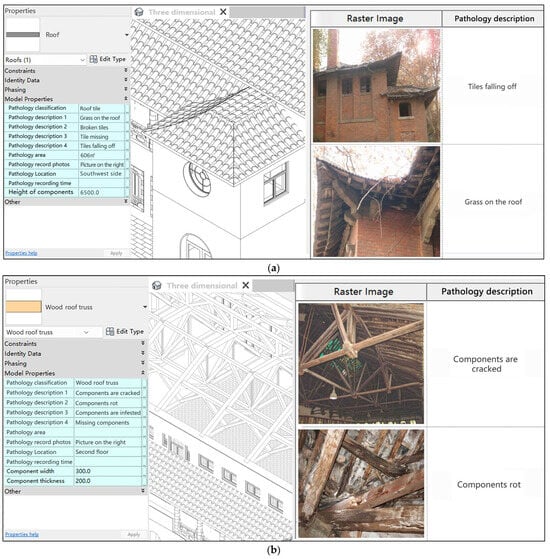 BIM, VR technology, etc., use VR technology to virtually display BIM digital information. Currently, the virtual display of digital information regarding historical buildings constitutes a research focus within BIM concerning architectural heritage protection. For example, Stanga, C. et al. (2023) [] have used technologies such as BIM and VR to build historical sites that can be explored virtually and to protect cultural heritage by providing opportunities for education and tourism. Ma, Y.-P. (2021) [] integrates BIM data of historical buildings and extends those data into the virtual environment, allowing users to perform virtual reality and environmental interaction and then conduct restoration research. Ji et al. (2018) [] used BIM, VR and video analysis technologies to develop a historical building restoration and virtual training system and established a digital historical building model containing three-dimensional models and attributes. The three-dimensional model is uploaded to the network platform, and users can browse it at high speed through the browser and perform functions such as virtual construction and disassembly, thereby gaining an in-depth understanding of the historical building structure and construction process. Baik et al. (2021) [] used BIM information models combined with point cloud data to build a three-dimensional interactive environment, providing a virtual three-dimensional model with rich interactive forms for historical building management. Shang et al. (2021) [] studied the use of HBIM by Sunxi Academy in Taichung City to visualize historical building data information. Li Ke (2016) [] applied the design results of historical buildings to the BIM model to realize the integration, organization and management of discrete engineering data information and generated thematic drawings through views, schedules, models, etc. This makes the logic expressed clearer and the degree of visualization stronger. Based on the above applications of BIM in historical buildings, people mainly focus on BIM data collection, model construction, virtual restoration and building information integration, etc., and neglect research on the actual monitoring, management and preventive protection of historical building pathology.