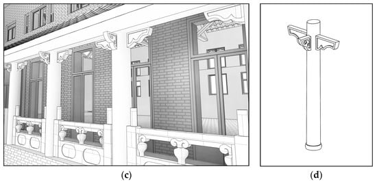 Detailed components (source: author). (a) Main facade of building. (b) Building exterior wall. (c) Building indoor, second floor. (d) Building eaves and corridors.