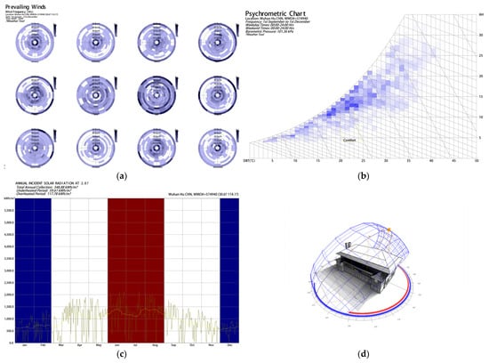 Environmental simulation analysis in Wuhan area (source: author). (a) Wind environment simulation. (b) Enthalpy and humidity analysis. (c) Analysis of due-north solar radiation. (d) Shadow distribution on the winter solstice.