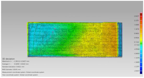 First, the area of the wall to be inspected at the James Jackson Gymnasium was segmented through point cloud cropping to obtain the point cloud data required for drawing. The trimmed data were then imported into Geomagic, and based on the flat wall data, a wall plane was fitted through the plane-fitting function as the datum plane for flatness measurement. A rainbow map was generated through comparison, the differentiated areas and deviation values were marked, and finally a height-difference comparison map was generated []. Compared with manual measurement, this method of comparing point cloud data is more efficient, more accurate, clearer and more intuitive. At present, this method is mainly used to analyze the damage and deformation of walls or masonry pavements.