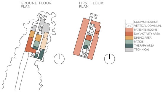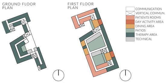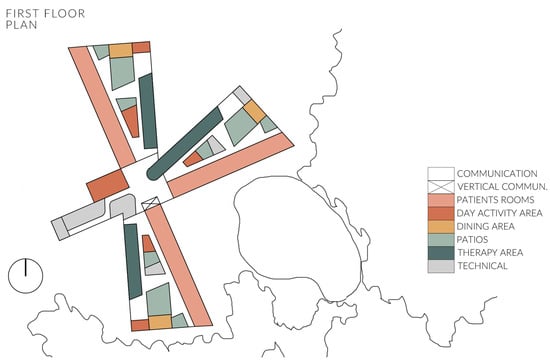 Elsinore Psychiatric Hospital was designed by the Bjarke Ingels Group (BIG) design studio in 2005. A characteristic element of architectural concept is the building’s form and its relationship with the landscape. The hospital consists of four parts that radiate from a central point. The ground floor crosses the area slopes to which it adapts. The first floor protrudes above the ground and functionally houses patient rooms. An additional element of the structure is an extended connector to the hospital’s first floor [68]. The functional connections discussed are included in the image (Figure 1).