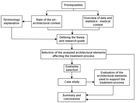 The presented research aims to investigate which architectural design issues influence the creation of healing architecture in mental health facilities. It consists of several stages presented in diagram (Scheme 1). Firstly, the prerequisites were derived, followed by the state of knowledge considered within architectural and medical contexts. The review served the purpose of research goals’ formulation. Then, we selected the architectural elements that stand out in the literature and are known for influencing a patient’s treatment process in psychiatric care facilities. These assumptions required confirmation, which was carried out based on case studies. The final stage of the research is a summary and conclusions.