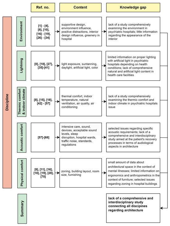 As explained, there is a direct relationship between architecture and the satisfaction experienced by hospital users [17]. As Chohan and Awad advise [67], due to technological advancement and the growing needs of clients, architectural design becomes an interdisciplinary domain, connecting diverse creative and engineering fields. In line with this idea, individual design disciplines were considered to then analyze the criteria. To summarize, the table (Table 1) illustrates issues connected to the environment, lighting, thermal comfort, indoor climate, acoustic comfort, and physical comfort in the context of healing architecture.