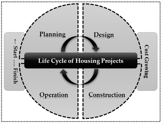 A house is a concept of human needs. To satisfy the human requirement for a house, a varied range of concepts have been presented to make houses more affordable [11]. Housing development is under pressure as a result of rapid urbanization. By 2030, around 40% of the world’s total population will need adequate housing and access to basic infrastructure such as energy. Until 2030, there is a need to build 96,150 residential units every day. As a result, in developing countries, bad governance has limited access to suitable housing [12]. According to a United Nations study, 50% of the world’s population currently lives in cities. This number is expected to increase to 70% by 2050. But, productivity in the construction sector has not increased at the same rate and has affected the housing market. The construction industry is now faced with greater obstacles to creating adequate and affordable living spaces and must change its mindset, and one of the ways is to embrace alternative construction methods [13,14]. In this section, the study of housing architecture as well as the concept of affordability are discussed to extract the effective criteria for providing suitable affordable housing. In Figure 1, this research’s purpose in the project life cycle is stated graphically.