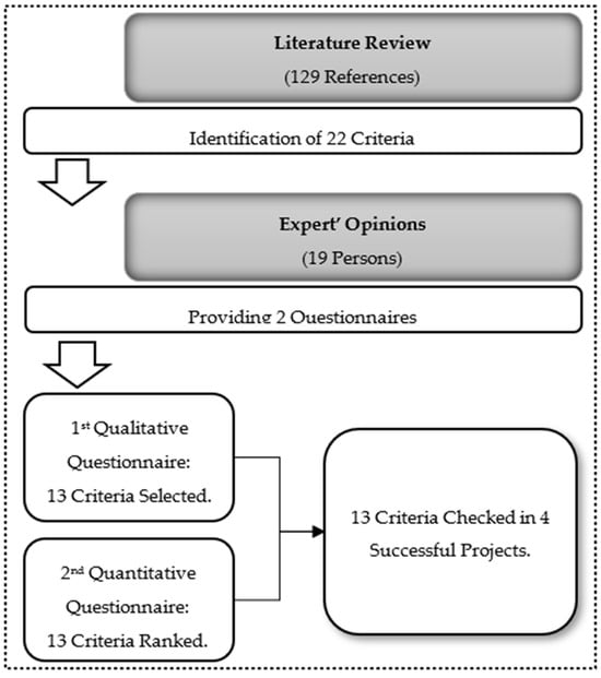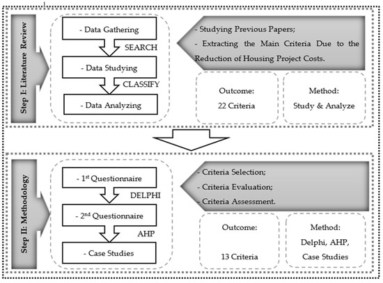 In this step, among the criteria that can be effective in the project’s success, the criteria that can be effective in reducing the cost of the affordable mass housing project are identified, and their weight and importance are calculated. Figure 2 represents the different steps of the research method. Criteria were extracted from each article or study that was reviewed, and finally, the questionnaire research method was used to analyze them. Therefore, at the beginning of this research, after reading the articles, gathering data, and analyzing them, 22 criteria were extracted.