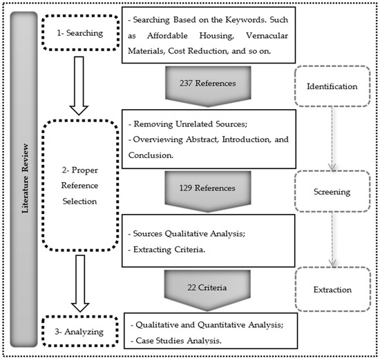 After the literature review, related studies were selected and reviewed based on keywords (237 references). The keywords include affordable housing, sustainable housing, prefabricated housing, traditional construction methods, modern construction, local materials, vernacular materials, and vernacular architecture. References were analyzed. Studies with similar topics were removed and, finally, 129 references were analyzed descriptively and the criteria were derived. The steps of resource selection and criteria extraction are given in Figure 3.