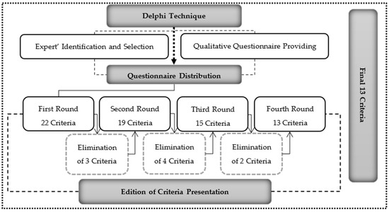 Three columns were placed for each criterion: Yes, No, and the column of experts’ opinions. They were also asked to express their opinion in summary regarding the criteria, and the Delphi technique was used in four rounds to analyze their answers. In the first round, out of 22 criteria, 3 criteria received 18, 19, and 18 negative responses out of a total of 19 responses. Therefore, they were removed from the list and the second round was carried out with 19 criteria. In the second round, four criteria received 17, 16, 18, and 16 negative responses and were removed. The third round started with the remaining 15 criteria, and 2 criteria with 16, and 15 negative answers were eliminated, and 13 criteria remained for the last round. In the fourth round, all 13 criteria received positive responses and 19 experts reached a consensus regarding the positive impact of these criteria. Therefore, 13 criteria were selected to prepare the next questionnaire. In Figure 5, the use of the Delphi technique to analyze the qualitative questionnaire of the first step is shown.