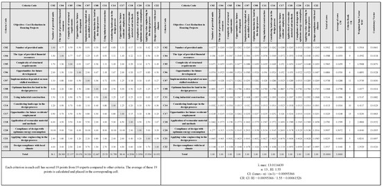 According to the results of the first step, and the research question “What are the effective criteria for reducing design and construction costs in a housing project?”, quantitative analysis of the criteria was needed. So, a 13 × 13 matrix was prepared to compare two pairs of criteria with each other to determine the criteria weight (CW) and was provided to the experts, and the experts were asked to rate the importance of each criterion between the numbers 1 and 10. It was also explained to them that the importance degree of C1 to C2 is the inverse of the importance degree of C2 to C1. Nineteen experts responded to the questionnaire, and as a result, their average scores were calculated for each cell and placed in the left table’s cells of Figure 6. The average calculated in each column is summed together and placed in the last row of the left table. The decimal numbers in the cells of the left table are because these numbers are the average of 19 points given by experts. Finally, the CWs and CRs (Criteria Ranks) were obtained using the AHP technique. In the matrix of the right table of Figure 6, the final results of AHP calculations are placed. In the cells of the right table, the average weight of each criterion (from the left table’s cells) is divided by the sum of the weights (from the last row of the left table), and the result is placed in the cell. Also, in the last row of the right table, the obtained weights are added together, which can be seen to be equal to one. In the column “Average of Rows”, the sum of the weights of each criterion in the row is divided by the number 13, which is the number of criteria, and the average CW is obtained based on the AHP technique. After calculating the CW, the rank of each criterion was determined. The criterion with the highest weight was ranked 1 and the criterion with the lowest weight was ranked 13. The Consistency Index (CI) of this matrix was calculated. The CI was 0.00095366 and the CR was 0.00061526.