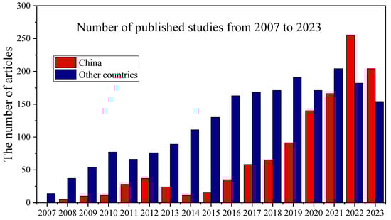 After gathering data and preprocessing, trend analysis takes precedence as the primary step. The volume of articles serves as a barometer of fluctuations in research interests within a particular domain. Hence, our initial comparison focuses on the annual publication output concerning prefabricated building in China and other nations. Figure 2 shows the trajectory of articles published over the past 15 years and reveals some differences between the two items, yet with a notably similar overall trend. Since 2015, there has been rapid growth in the number of documents pertaining to prefabricated building in China, surpassing the total number of documents in other countries by 2022.