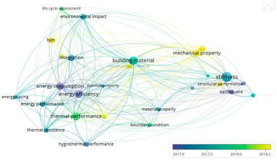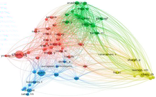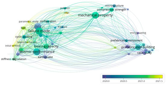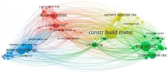 Figure 3 shows that all journals are categorized into four clusters, denoted by yellow, green, blue, and red. The largest number of items appears in Construction and Building Materials, which primarily publishes articles related to construction materials in the AEC industry, while other journals in this cluster (yellow) also feature articles concerning materials. The green clusters are predominantly focused on scrutinizing structural aspects and methodologies for extracting pertinent information from them. Publications within the blue cluster are dedicated to advancing the sustainable development of construction projects by delving into the intricate interplay between structures and the environment. The red cluster predominantly publishes articles related to the application of prefabricated building and its construction method.