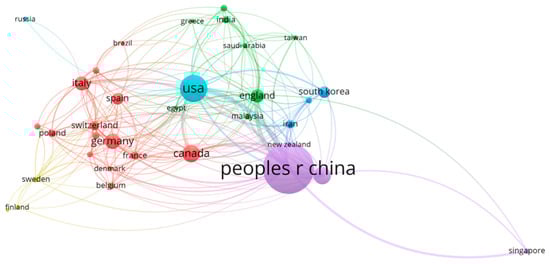 It is noteworthy that despite the substantial collaboration between China and the United States, they are identified as separate clusters. This distinction occurs because the volume of publications from each of these countries is both equal to and significantly surpasses that from other countries.