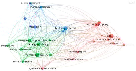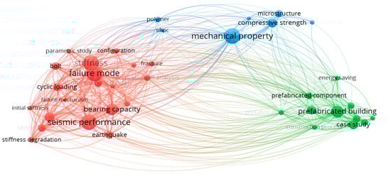 Using the same methodology, we performed a keyword co-occurrence analysis of the literature on prefabricated building from developed countries, as shown in Figure 7. The definition of the circle and line in Figure 7 is consistent with those in Figure 6. After synonym consolidation and the removal of extraneous keywords, we categorized the 57 high-frequency keywords into three distinct clusters. Cluster 1 delves into the research on energy-efficient building systems, Cluster 2 explores seismic performance across various construction systems, and Cluster 3 investigates thermal performance.