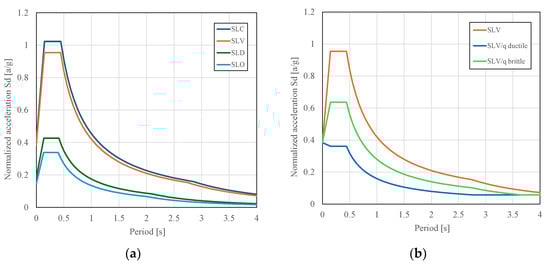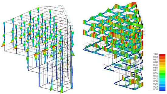 - For ductile structural elements, the seismic load reduced by the behavior factor q (assumed in the range 1.5–3) is applied, checking that the stress or force in every element is less than the corresponding strength value. The authors choose the factor q in accordance with the criteria reported in the chapter 7 of the Italian Standards [2], correlating the overall ductility of the structure to the structural type, taking into account a minimum dissipative condition, that is, low ductility and irregularity in the plan and elevation of the structure. This hypothesis is supported by the following aspects: spatial frames are present in the two directions, strengthening interventions are foreseen for all the load-bearing elements, and the new construction of the missing floors is planned with composite steel–concrete structures in which the top slab thickness makes it possible to consider floors rigid in their plan. Therefore, in accordance with the Italian Standards, a behavior factor q = 2.6 was assumed.