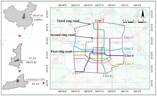 This study attempted to address the above research gaps by taking Xi’an, a plains-type megacity in China, as an example. As shown in Figure 1, Xi’an takes the form of a checkerboard and ring road network. It had a population of nearly 13 million in 2022, a built-up area of 806 km2, and an urbanization level of nearly 80% []. As of January 2024, the length of rail transit operation was 312 km, with a total of 214 stations on 10 lines [], of which 6 lines operated within the city’s third ring road. In 2023, the average daily passenger flow intensity was able to reach 3.64 million passengers/day. It is expected that by 2029, nearly 200 km of new lines will be added on top of this [].