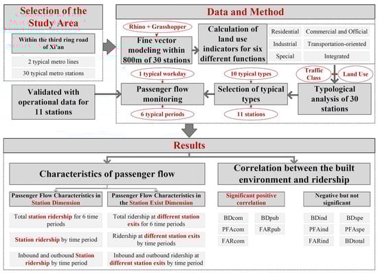 This study took 30 typical stations of Line 1 and Line 2 within the third ring road as specific research objects. Figure 2 shows the analytic flow of the study. Firstly, it was considered that the guidelines and standards issued by the government are mandatory in actual construction []. Based on the two relevant guidelines in China, this study extracted the four traffic levels and six types of building functions to form a new classification system. At the same time, a built environment dataset was constructed through fine vector modeling of the stations and the surrounding built environment, and 10 typical stations were typologically analyzed based on this classification system. Secondly, 11 typical stations of different types were selected, field monitoring was carried out, and the passenger flow characteristics of different types of stations were analyzed. Finally, the correlation of different factors of the built environment with passenger flow was verified. This study provides guidance and reference for similar megacities with ancient city centers in terms of the optimization of the urban spatial structure, the renewal of stations and the surrounding built environment, and the management of station operation.