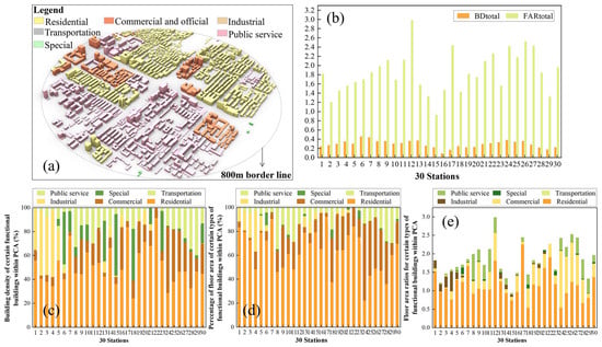 (a) Fine-scale vector modeling of the built environment in a station’s CA using North Street as an example; indicators of the built environment within the CAs of 30 stations: (b) total building density and total floor area ratio; (c) building densities of certain types of functional buildings; (d) percentage of floor area of certain types of functional buildings; and (e) floor area ratios for certain types of functional buildings.