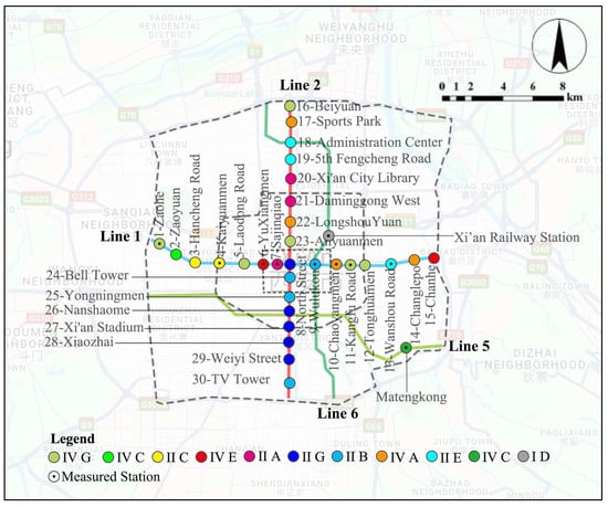 Based on the results of the typology analysis described in Section 2.4, we found that the 15 stations of Line 1 covered nine types, while the 15 stations of Line 2 covered only six types. Therefore, we selected Line 1 as the monitoring object. Notably, in order not to confuse the passenger flow on North Street (of the II G type), where Line 1 and Line 2 intersect, we replaced this station with Xiaozhai (of the II G type), which had the highest passenger flow on Line 2. Meanwhile, Xi’an had four train stations, and we added the hub transportation type (I D), i.e., Xi’an Railway Station, as a supplement. In addition, considering that Line 1 and Line 2 did not have departure stations, we selected Matengkong, the eastern departure station of Line 5 near the boundary of the third ring road, as a supplement for this type. In the end, 11 stations were chosen for monitoring, and the distribution of the measured stations is shown in Figure 4. Figure 5 shows the differences in the built environments of the 11 different types of stations.