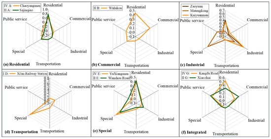 Radar map of the characteristics of the built environments of the 11 stations: (a) residential; (b) commercial and official; (c) industrial; (d) transportation-oriented; (e) special; and (f) integrated.