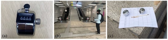 To obtain the passenger flow data at different exits of the stations, manual counting was performed using push counters, as shown in Figure 6. On a typical weekday (Wednesday, 15 February 2023), the number of people entering and exiting the station at each exit was counted at six moments (8:00, 10:00, 12:00, 15:00, 18:00, and 20:00). Each exit was recorded for 5 min. We assumed that the passenger flow in 5 min represented the level of passenger flow in 1 h and normalized the 5 min data to the 1 h passenger flow. One person was positioned at each station during the measurement process, and the measurements were carried out at all stations simultaneously.