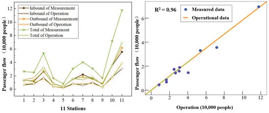 The operational ridership data from 11 stations on a typical weekday (13 December 2023) provided by the official Xi’an Metro were used for verification. The operation data included the daily inbound, outbound, and total passenger flow of the stations, and they excluded the dimensional data of the exits. As shown in Figure 7, the validation results showed that the measured and operational data of the 11 stations were significantly correlated with each other, with an R2 of 0.96. This confirmed the feasibility of the monitoring method and the accuracy of the measured passenger flow data.