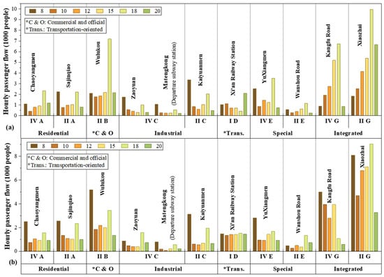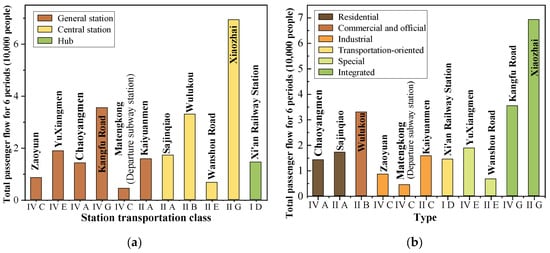 Based on the different traffic levels and building functions, the total station ridership for six periods was analyzed. Figure 8a shows the results with the traffic level as the classification factor. The average total station ridership for six periods for the four stations that were classified as central stations was the highest (31,551); those of general stations (16,176) and hub stations (14,496) were close to each other. Xi’an Railway Station, as an urban railroad hub station, did not have a high passenger flow. This suggested that a high-level hub connecting with the city’s external transportation did not necessarily generate significant intra-city transfer traffic. Figure 8b shows the results when using building functions as the classification factor. The results showed that integrated (52,422) and commercial stations (33,000) had significantly greater values than those of other types; those of residential (15,660) and transportation-oriented stations (14,496) were normal, and those of special (12,750) and industrial stations (9532) were lower than those of the other types. This indicated that integrated functions, such as commercial and office functions, are the core functions that attract passengers.
