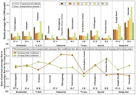 - Residential: Both types of residential stations had a moderate passenger flow and bimodal peak intensity. There were significant morning and evening peaks, and the bimodal intensity was close, with an average peak coefficient of 0.27.