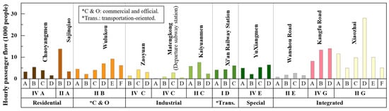 In this study, based on the guidelines issued by the Chinese government, the station traffic level and different building functions within the CAs that were 800 m around the stations were extracted as classification factors. A new classification system was developed, and it is highly applicable to all cities in China. In addition, field measurements were performed to analyze the passenger flow patterns at different types of stations, demonstrating that the different functional characteristics of a station’s close vicinity result in different station passenger flow characteristics.