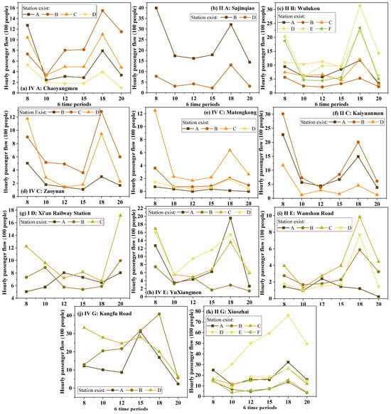 Figure 12 shows that the spatiotemporal characteristics of the passenger flows at different exits of different types of stations showed significant differences.
