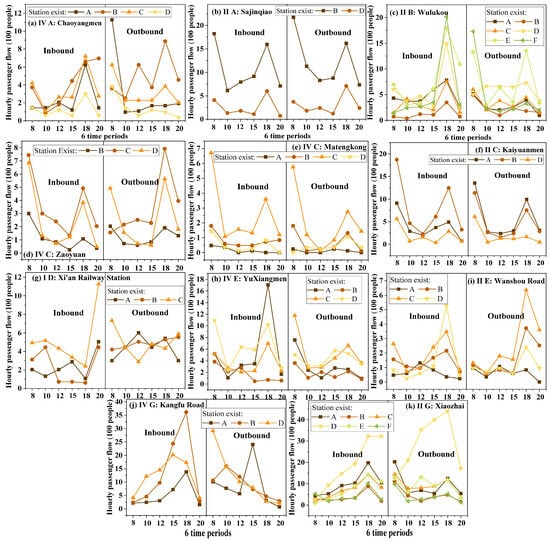 - Integrated: The spatiotemporal characteristics of the inbound flows of the two types were close, and only significant evening peaks were manifested for inbound flows. However, for the outbound flows, there were significant morning peaks at two exits and only evening peaks at one exit at IV G. There was a significant evening peak at the exit that directly connected to a commercial complex at II G, and the remaining five exits exhibited stronger morning than evening peaks, which was the opposite of what is shown in Figure 12. This suggested that the multiple connections of integrated stations to commercial complexes have a significant impact on the overall passenger flow at these stations.
