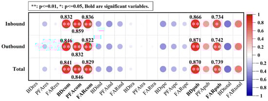 To further analyze the relationship between different urban functions and intensities within the CAs and passenger flows, bivariate correlation analyses were conducted between the three operational passenger flow indices and seven types of indicators of the built environment for 30 stations. Figure 14 shows the details of the indices and the results.