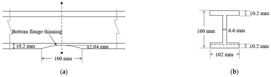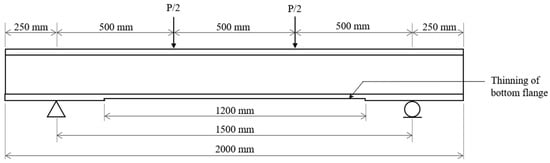 - Due to the thinning of the bottom flange of the beam, both the yield and the ultimate load capacities of the beam were reduced. The reduction in the ultimate load followed a nearly perfect linear trend. For every 2.5% thickness loss of the bottom flange along 80% of the beam’s span, the ultimate load was observed to reduce by roughly 1.5%.
